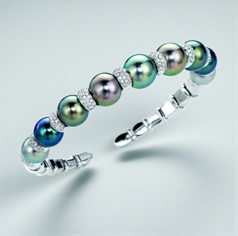 An 18k white gold bracelet showcasing 9–11 mm Tahitian pearls and 1.80 ctw diamonds — a fluid harmony of ocean beauty and master craftsmanship.