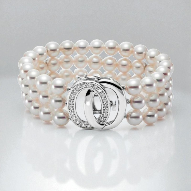 Mastoloni’s 3-Row 7-7.5mm White Akoya Pearl Bracelet, featuring a stunning 18kt white gold & diamond clasp (1.06 TCW). A perfect blend of timeless beauty and modern luxury.
